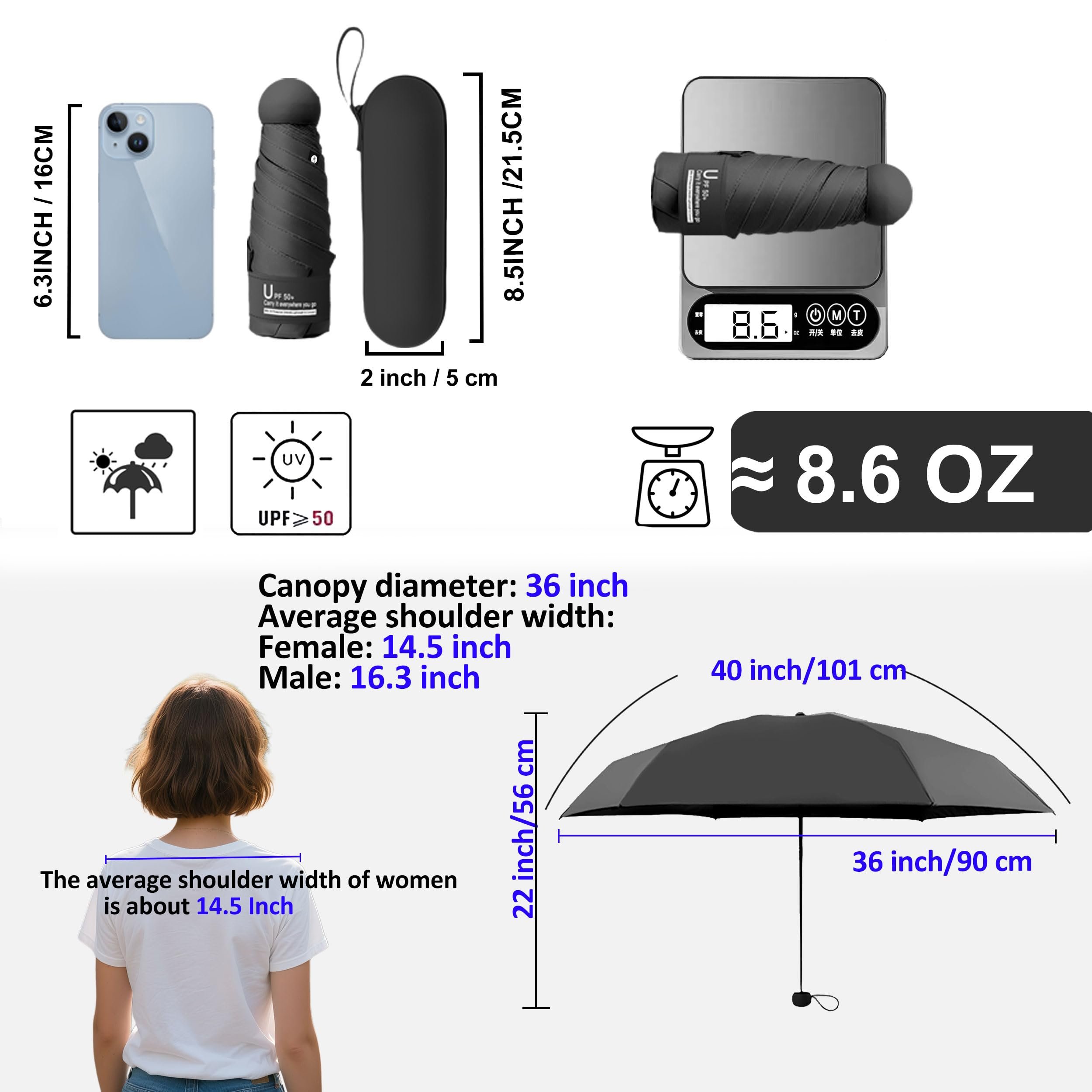 🎒 Ultra-Compact & Travel-Friendly: Folding down to just 6.9 inches, this mini umbrella fits easily into your purse, pocket, or travel bag. With a 40-inch arc and 35.4-inch diameter, it provides ample coverage without bulk.